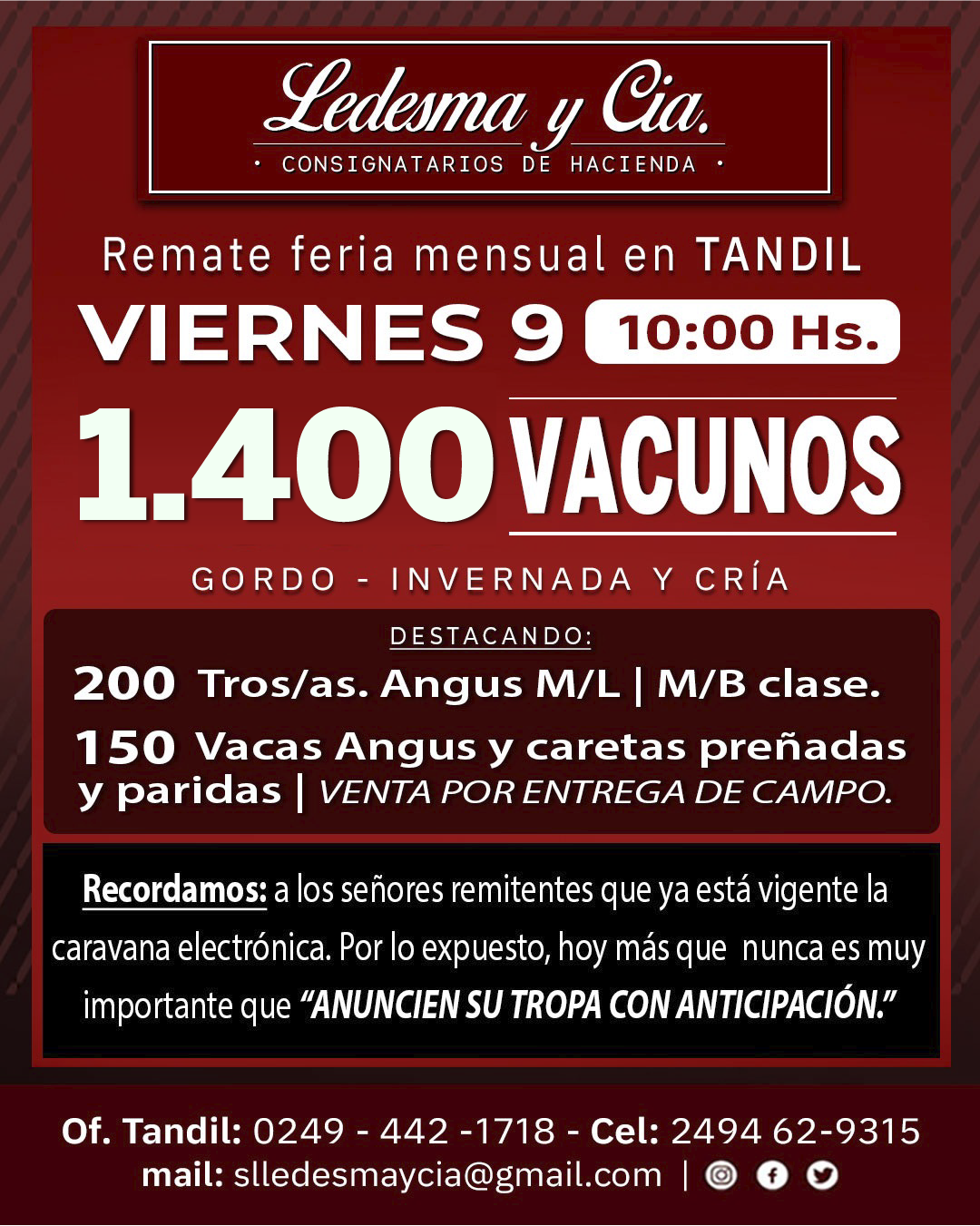 30 AÑOS JUNTO A LA GENTE DE CAMPO Remates feria mensuales Remate de reproductores Ventas en el Mercado Agroganadero Alquiler y venta de campos PRÓXIMOS REMATES REMATE DE HACIENDAS GENERALES 📌 Sociedad Rural de Tandil 📆 Viernes 9 de Enero ⏱️ 10:00 Hs Maipú 781, Tandil. [email protected] 249-4683061 249-4421718 Nuestras Redes FollowFollow