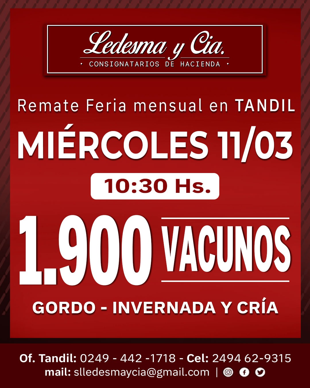 30 AÑOS JUNTO A LA GENTE DE CAMPO Remates feria mensuales Remate de reproductores Ventas en el Mercado Agroganadero Alquiler y venta de campos PRÓXIMOS REMATES REMATE DE HACIENDAS GENERALES 📌 Sociedad Rural de Tandil 📆 Marzo ⏱️ Maipú 781, Tandil. [email protected] 249-4683061 249-4421718 Nuestras Redes FollowFollow